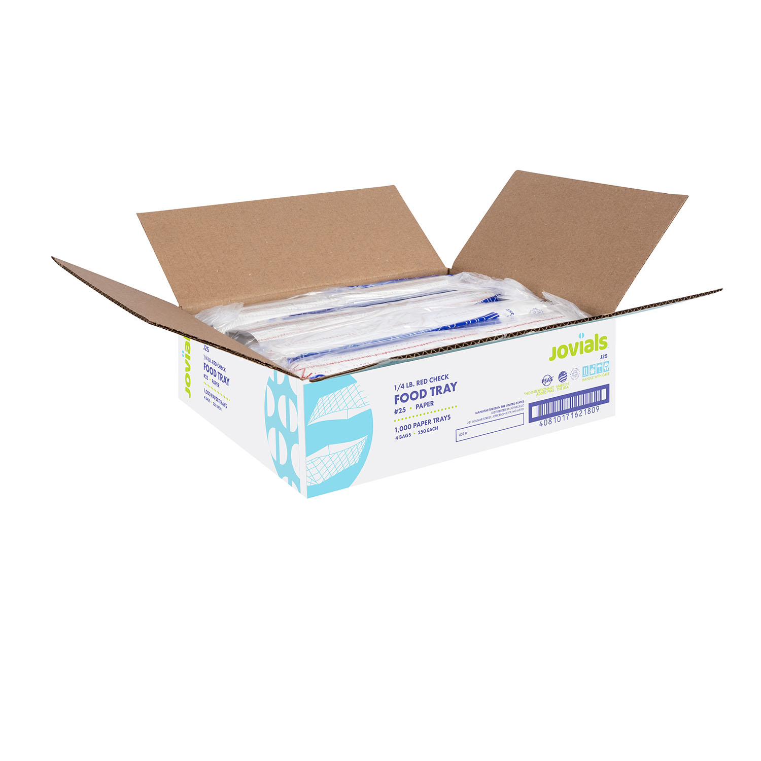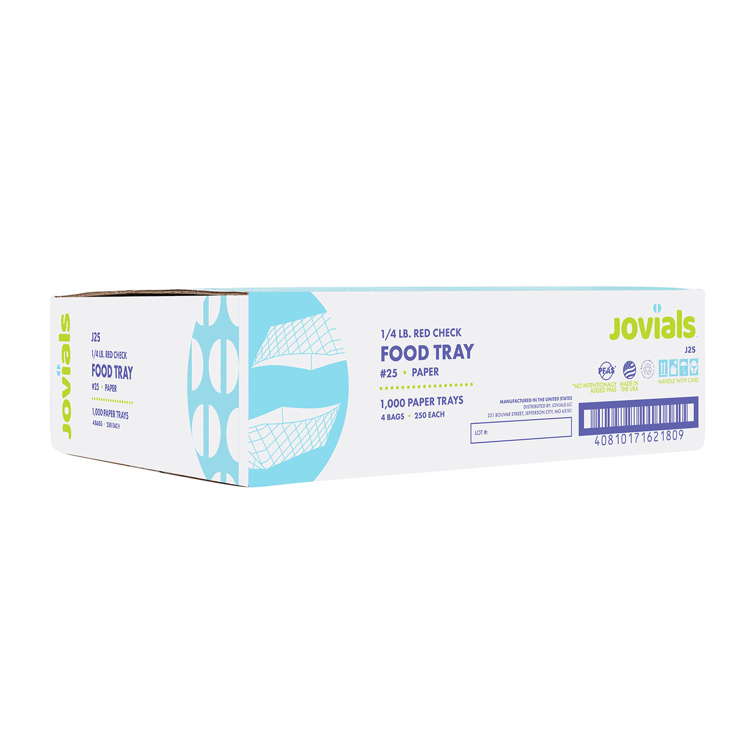 Jovials #25 (1/4 lb.) Paper Food Trays are sturdy, microwaveable, and made to handle hot or cold foods with ease. The red checkered design adds a classic touch, while the grease-resistant clay coating keeps things clean. Compostable, recyclable, and made without intentionally added PFAS.