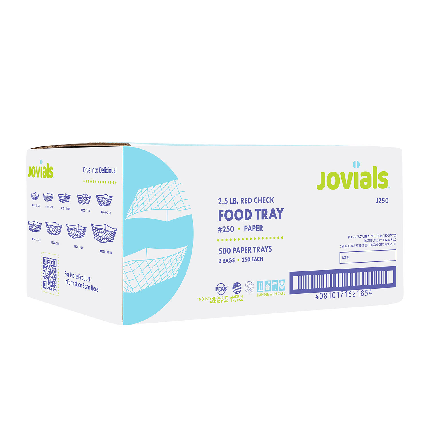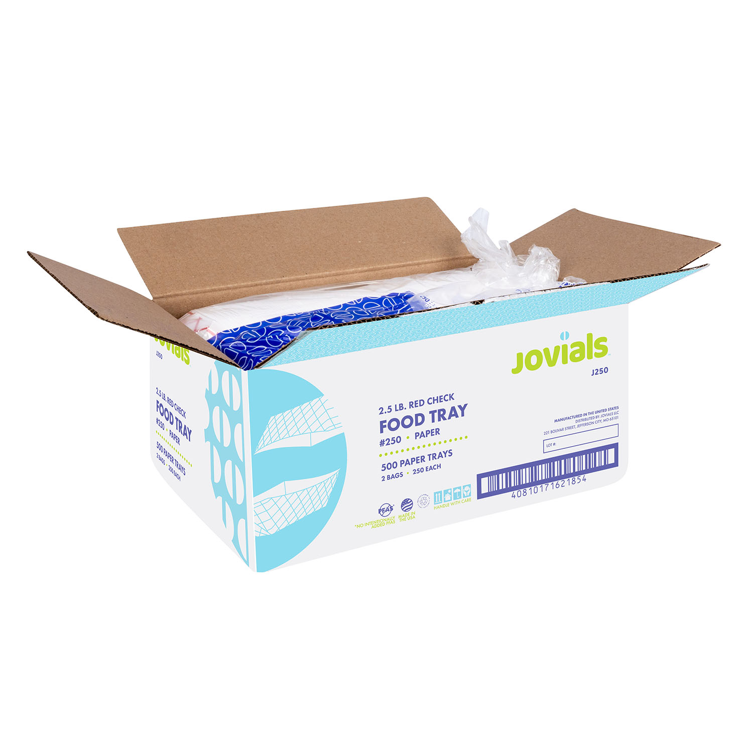 Jovials #250 (2.5 lb.) Paper Food Trays are your go-to for anything you serve—hot, cold, or in between. Made from sturdy paperboard with a classic red checkered design, they are microwaveable, grease-resistant, and stackable. Plus, they’re recyclable, compostable, biodegradable, and free from intentionally added PFAS.