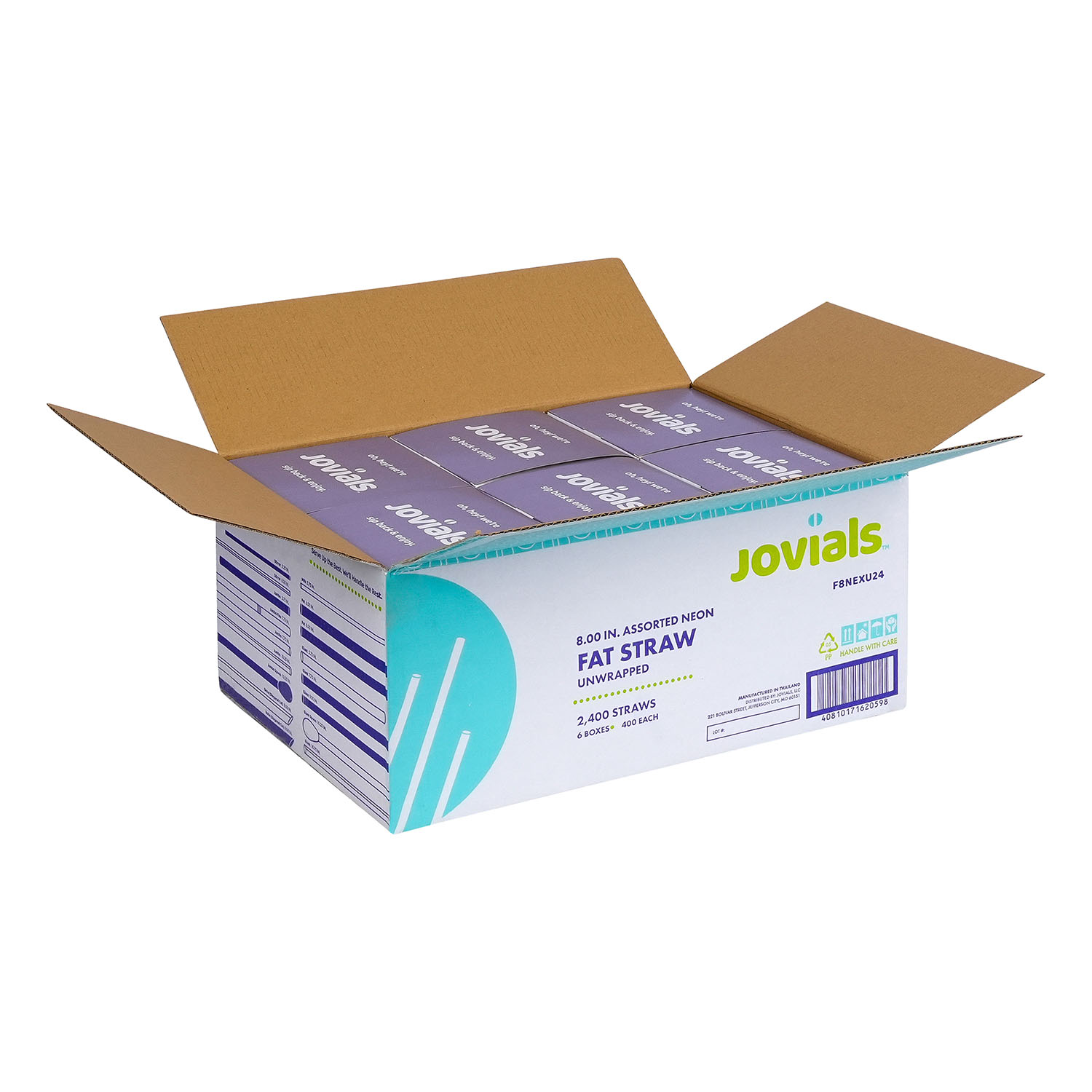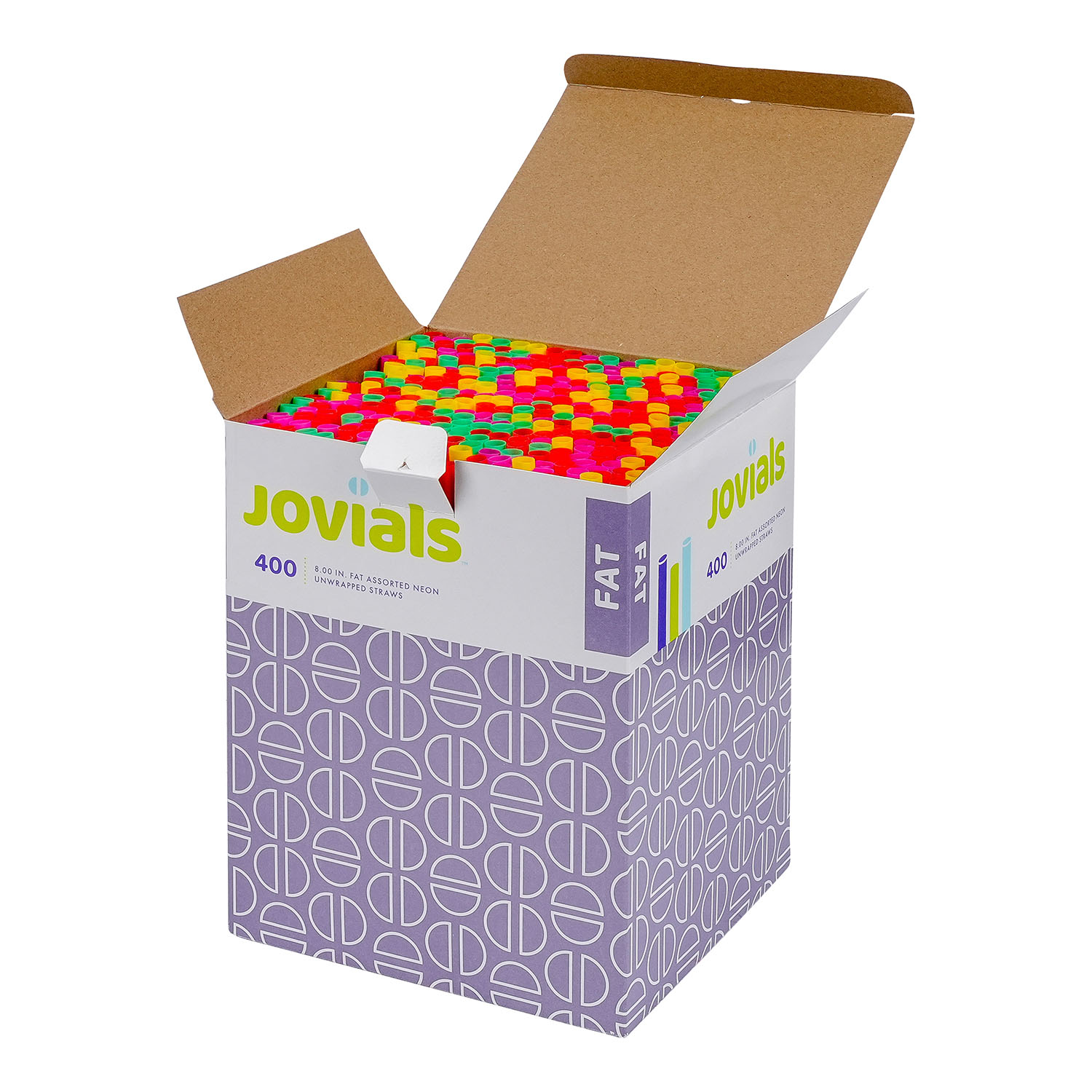 Jovials Fat 8" Neon Straws are perfect for thicker drinks like smoothies, milkshakes and slushies. Made with strong plastic construction, they come boxed and unwrapped for fast placement and service, making them ideal for restaurants, concession stands, and cafés.