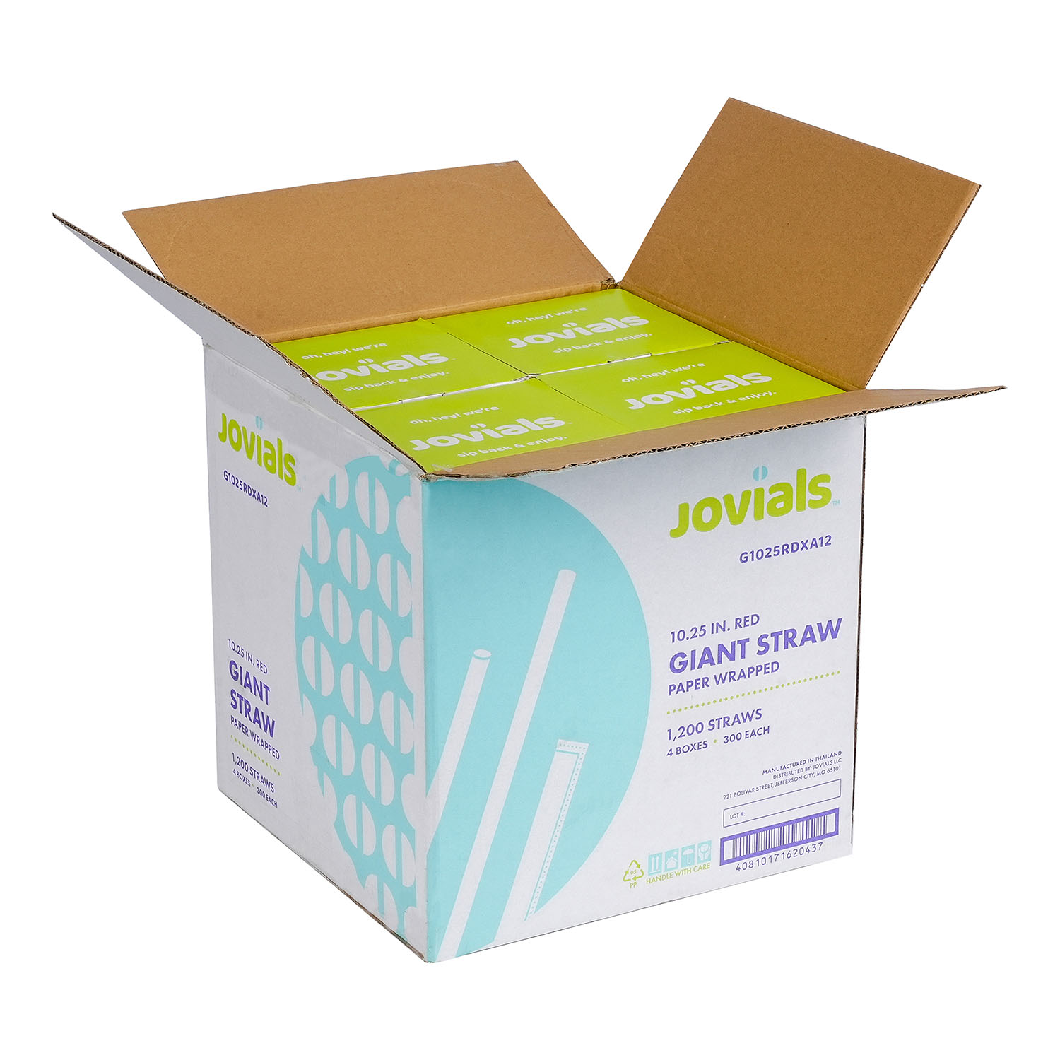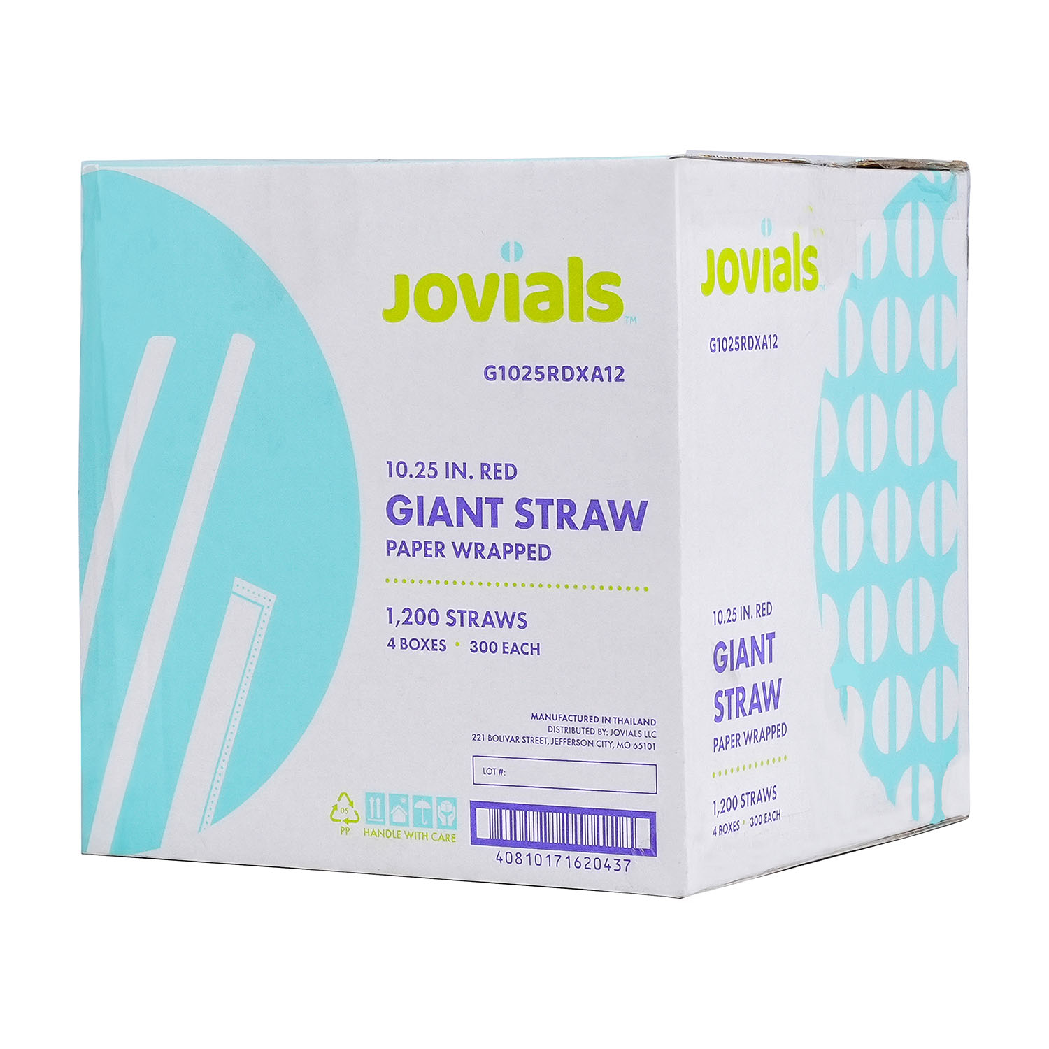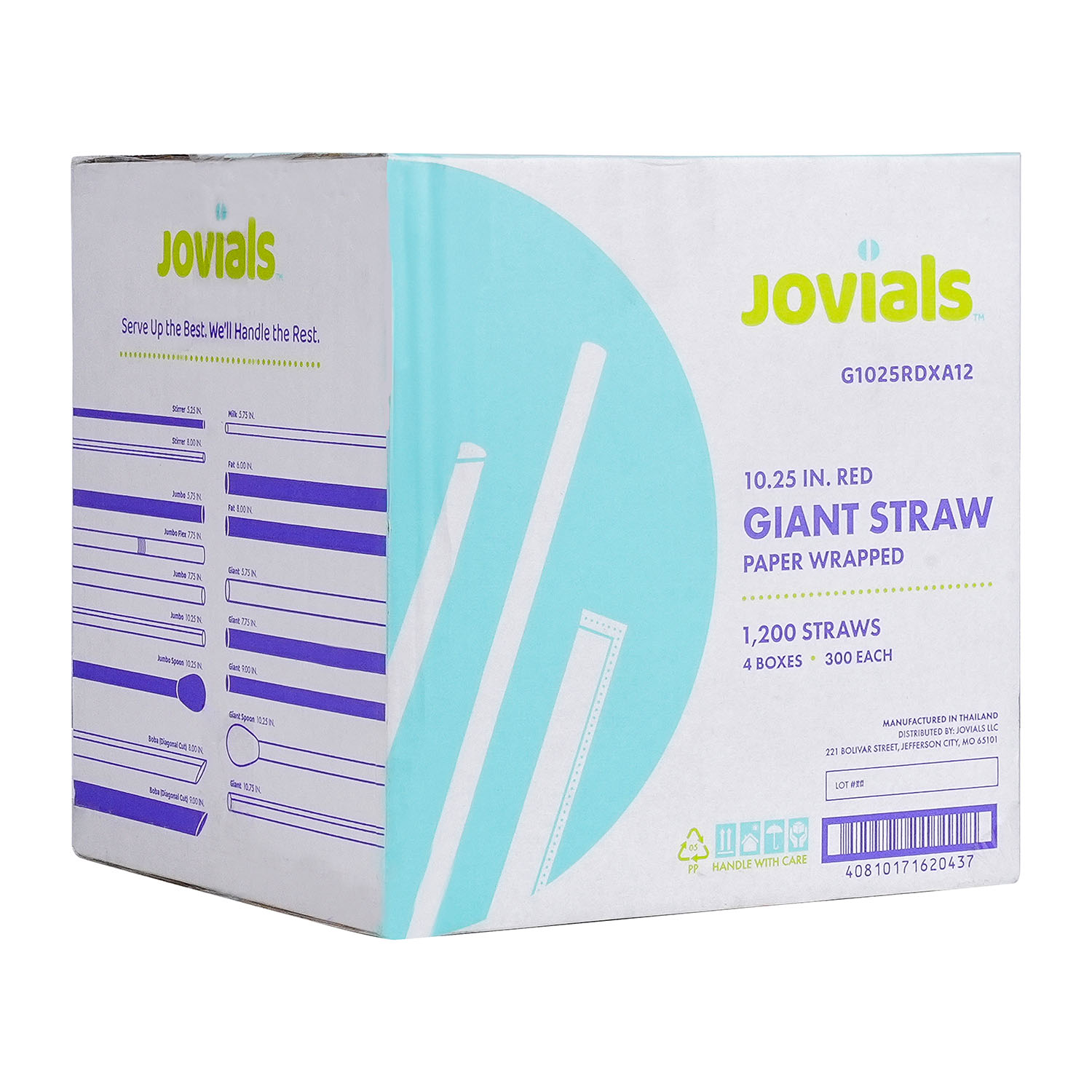 Jovial’s Giant 10.25" Red and White Stripe Straws, featuring a classic design, perfect for milkshakes and smoothies. Individually paper-wrapped for sanitation and boxed for convenience, they’re ideal for restaurants, concession stands, and cafeterias.