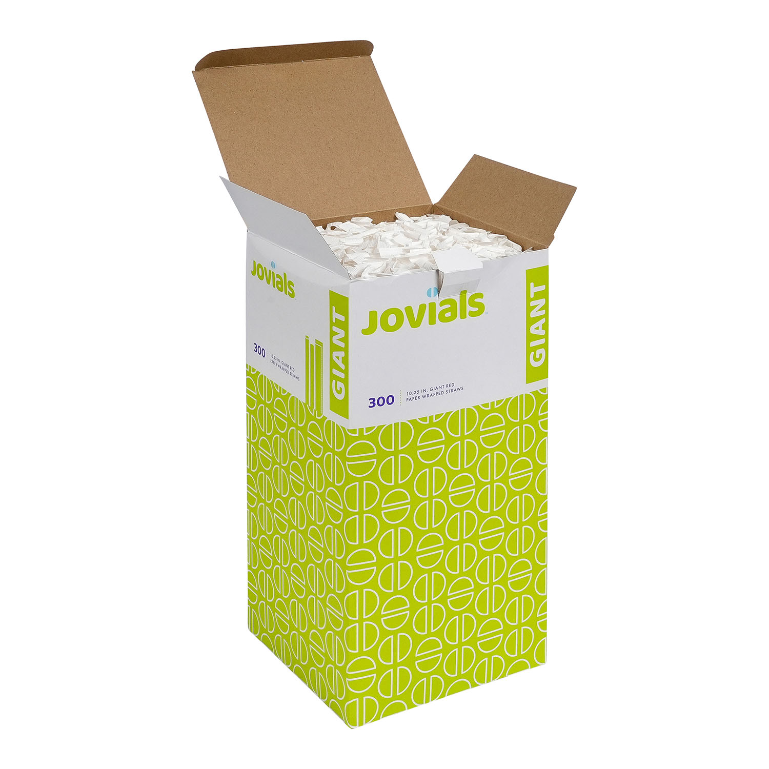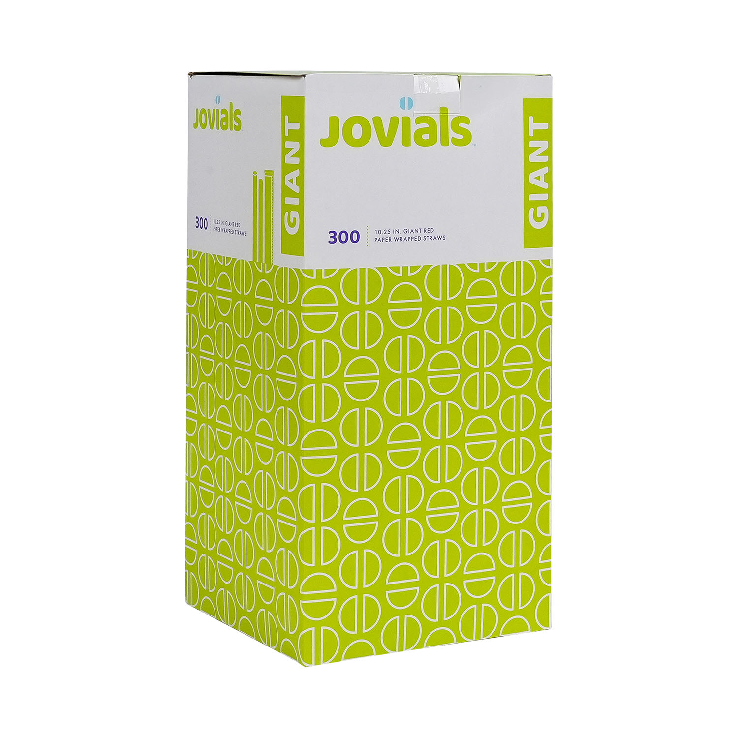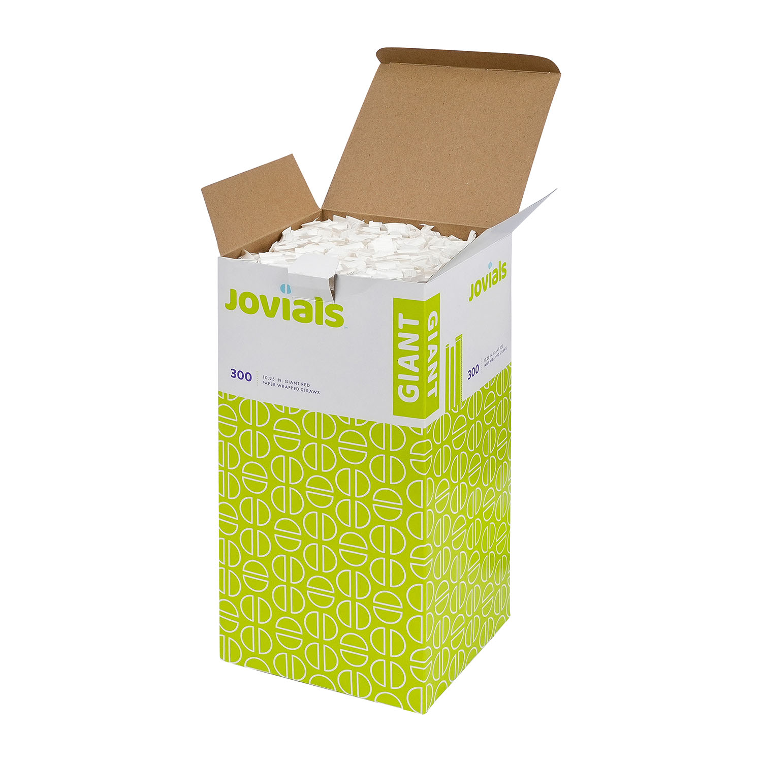 Jovial’s Giant 10.25" Red and White Stripe Straws, featuring a classic design, perfect for milkshakes and smoothies. Individually paper-wrapped for sanitation and boxed for convenience, they’re ideal for restaurants, concession stands, and cafeterias.