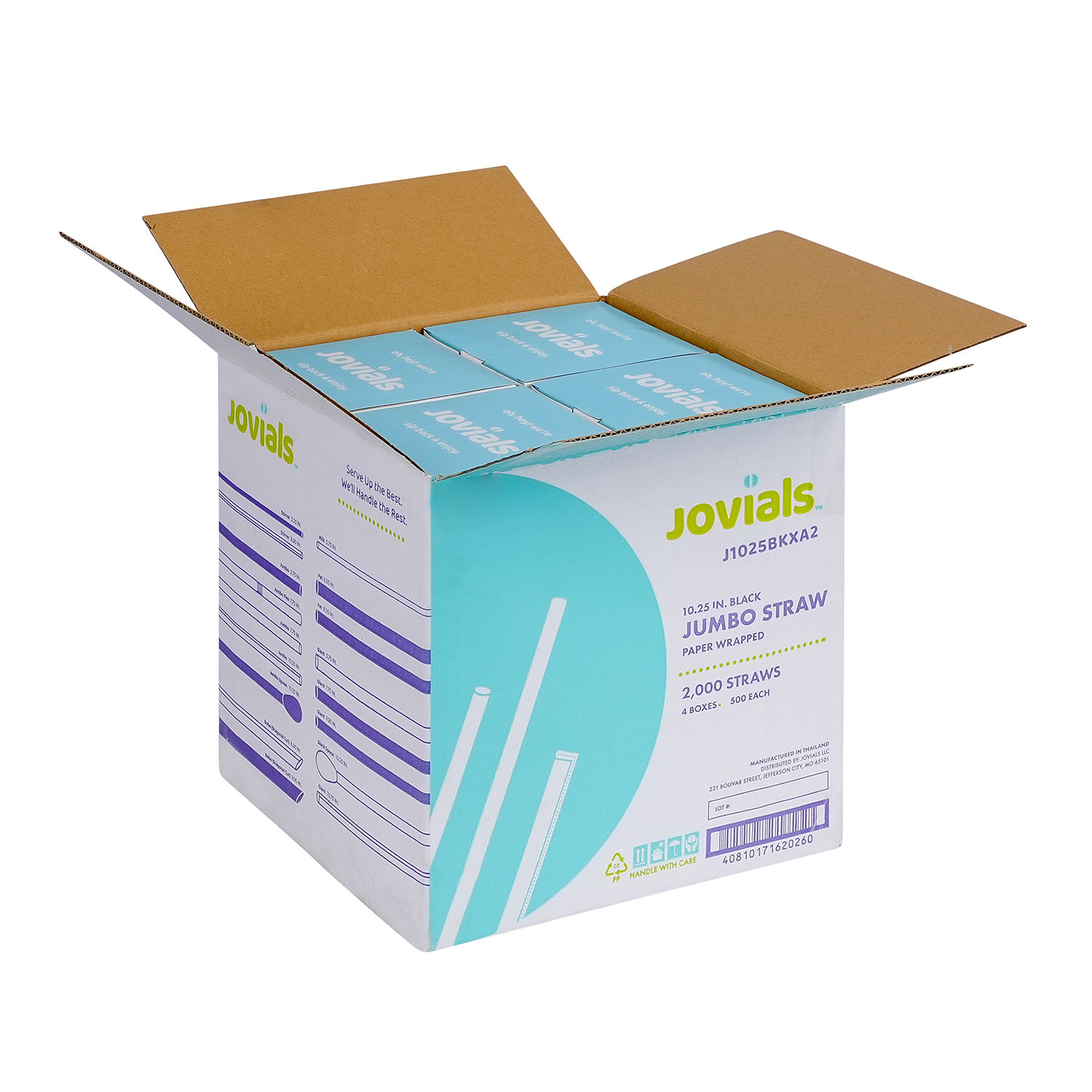Designed for water, juice, and soda, Jovials Jumbo Black 10.25" Straws are individually paper-wrapped for hygiene. Conveniently boxed and ideal for high-traffic food service locations.