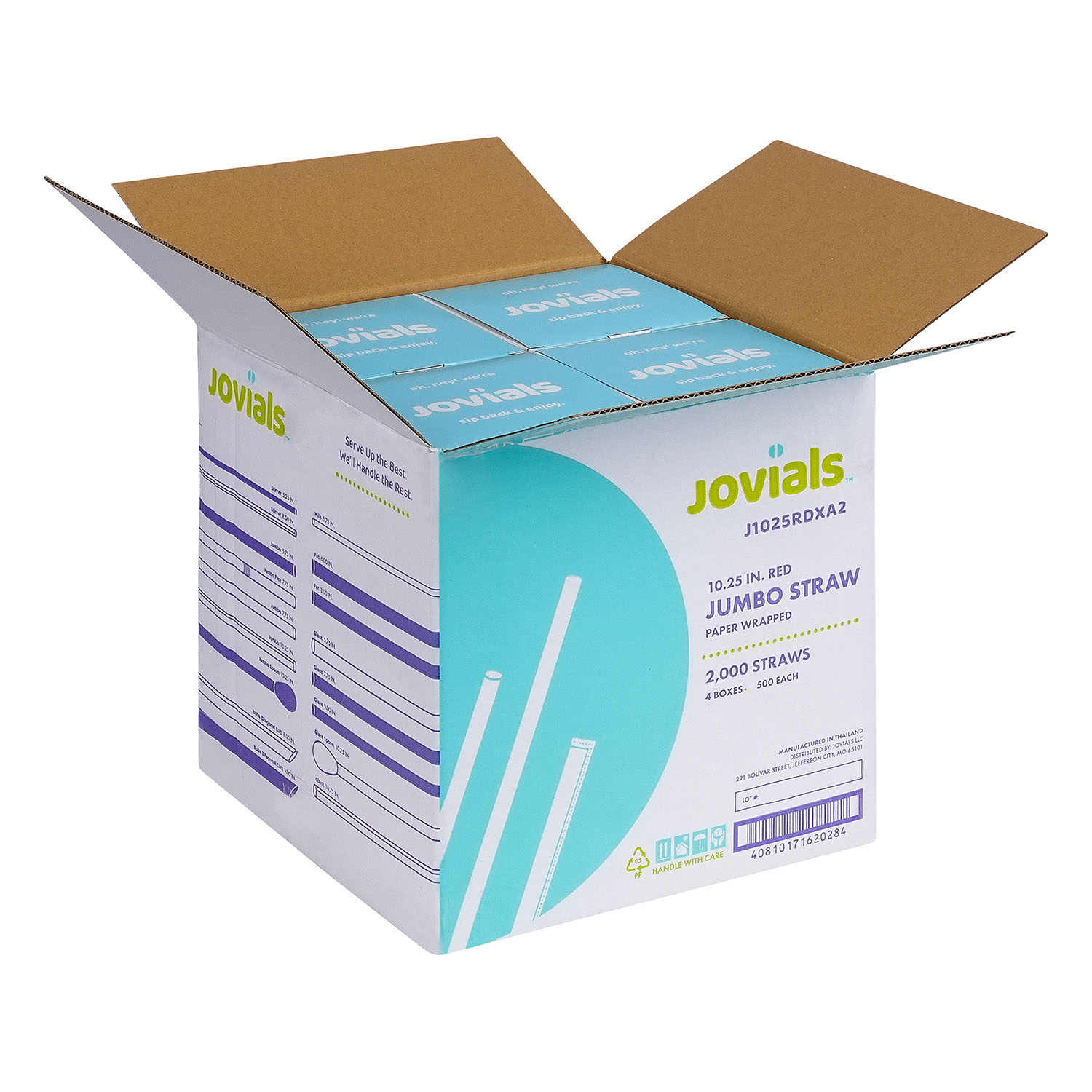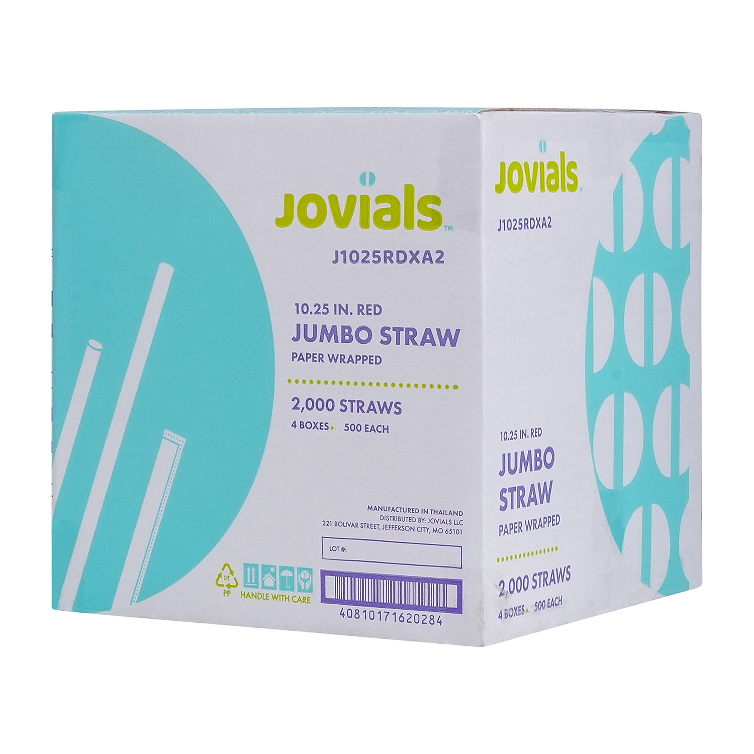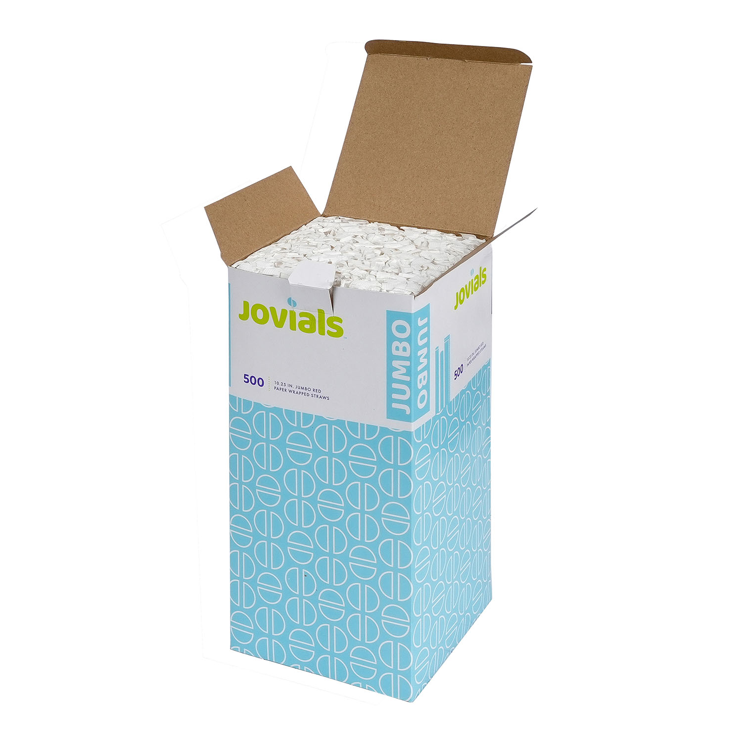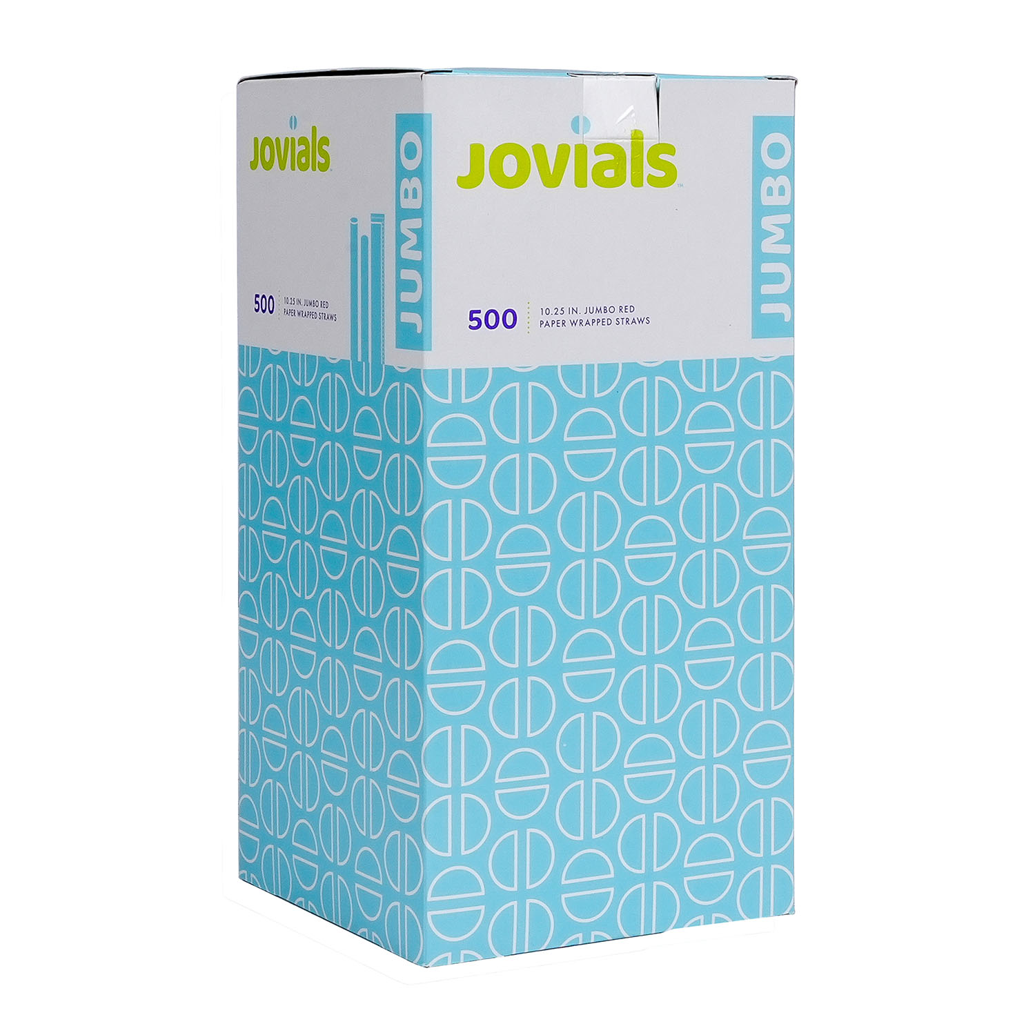 Designed for water, juice, and soda, Jovials Jumbo Red 10.25" Straws are individually paper-wrapped for hygiene. Conveniently boxed and ideal for high-traffic food service locations.