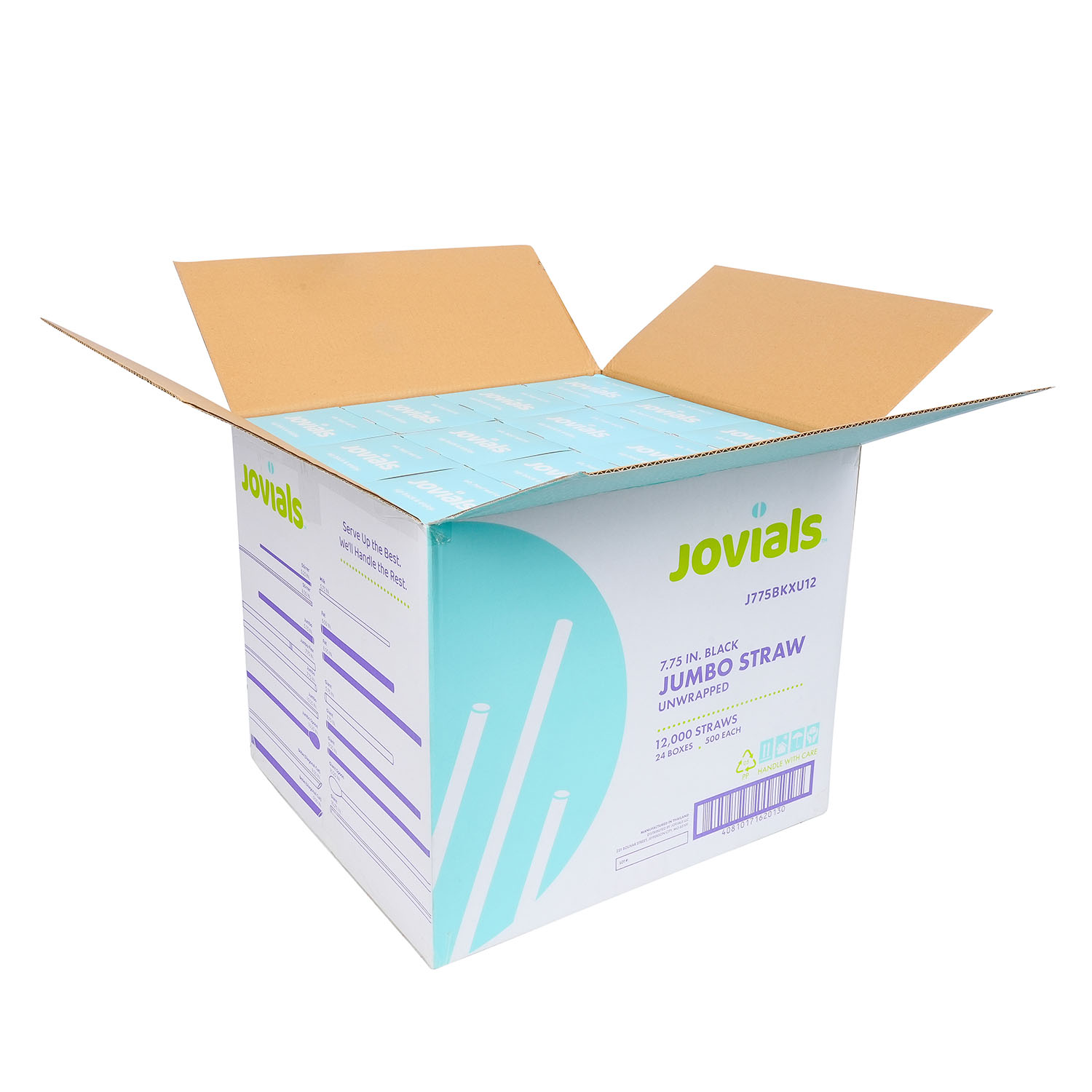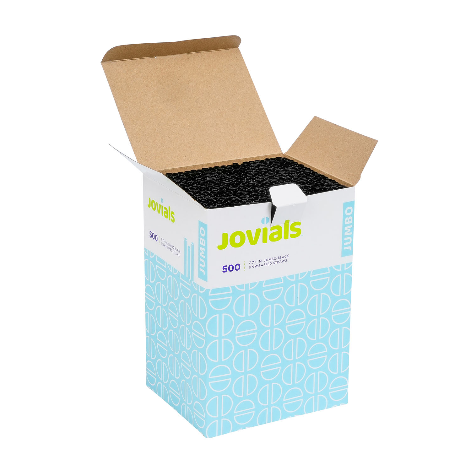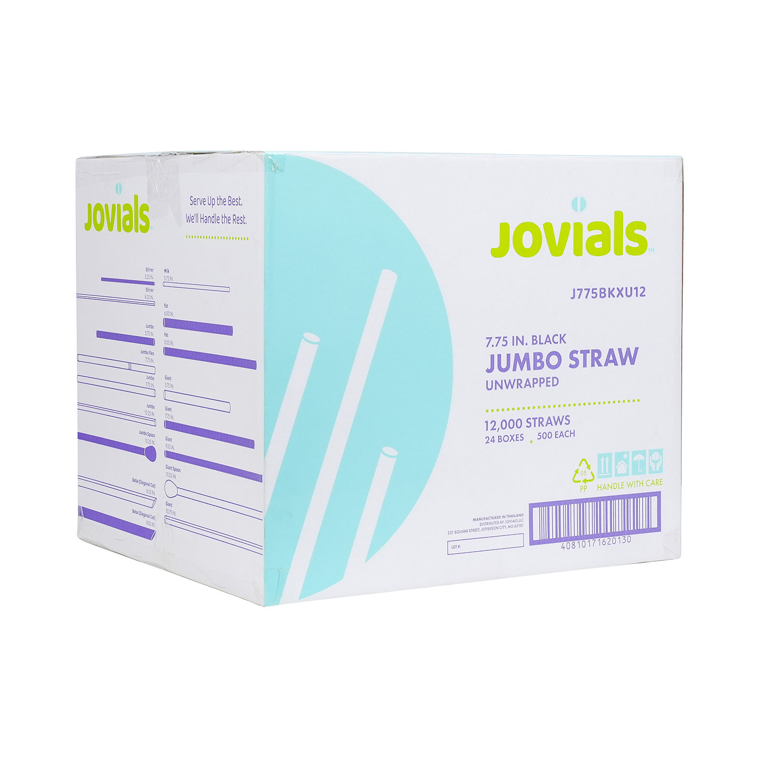 Designed for water, juice, and soda, Jovial’s Jumbo Black 7.75" Straws come unwrapped for quick and easy use. Conveniently boxed and ideal for high-traffic food service locations with bulk dispensers.
