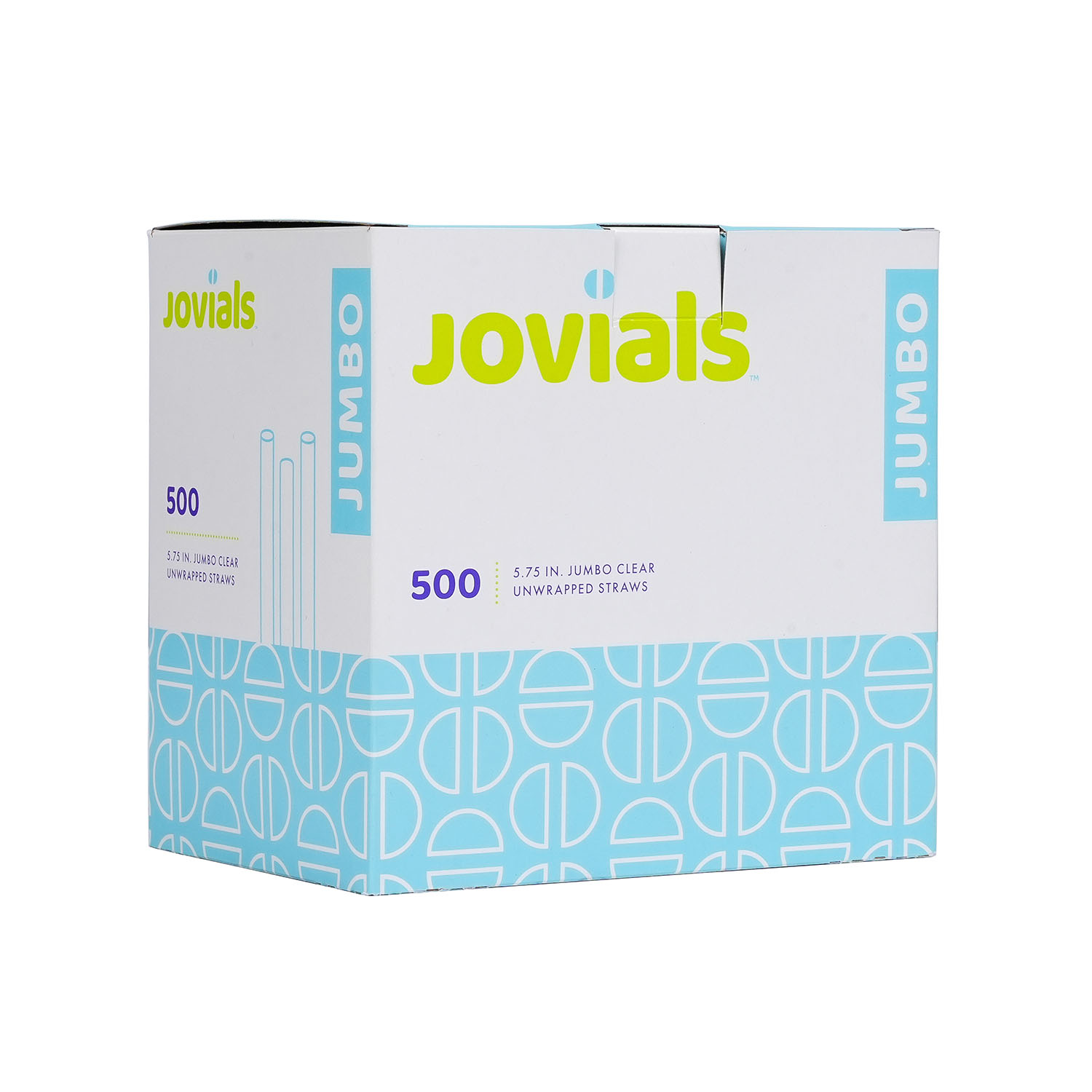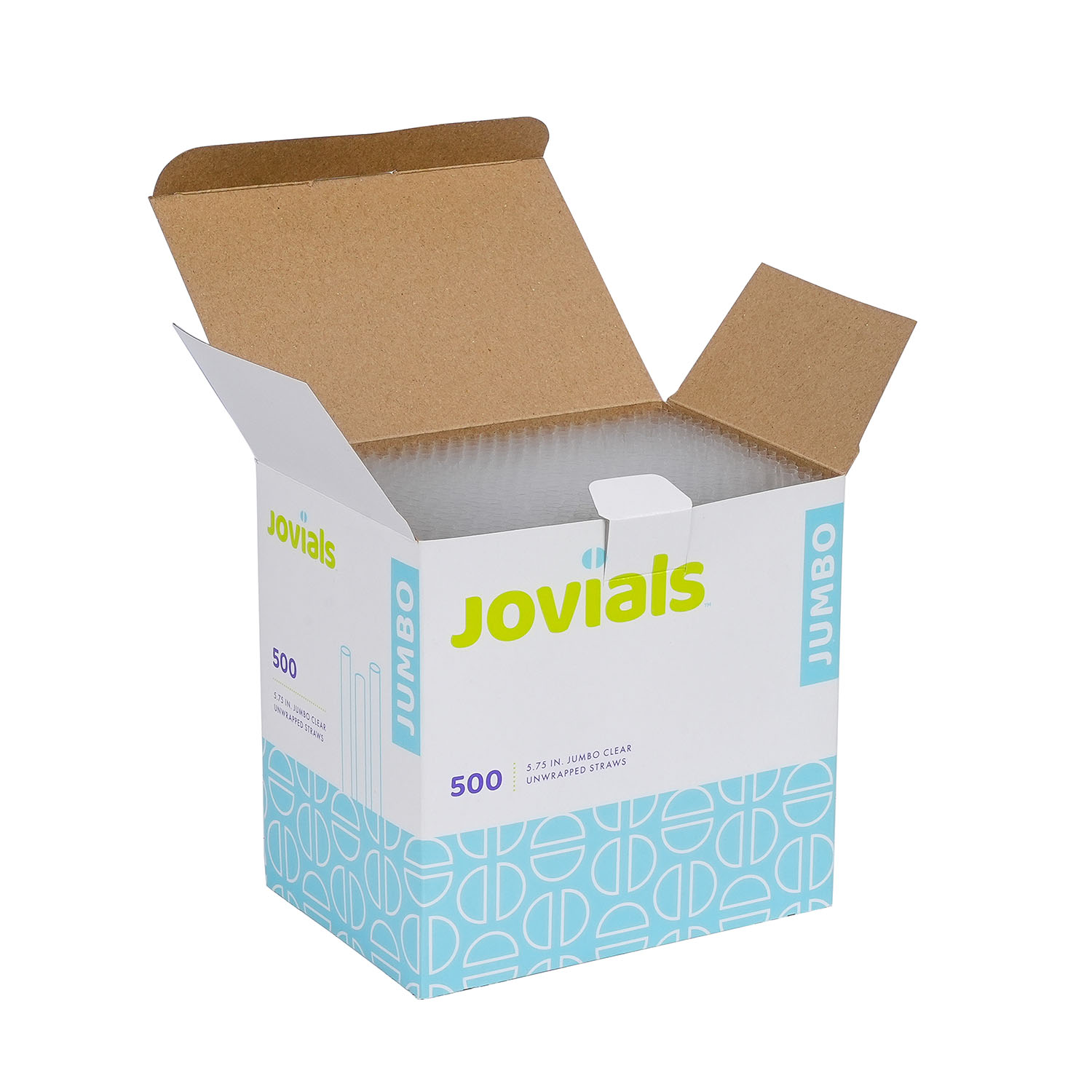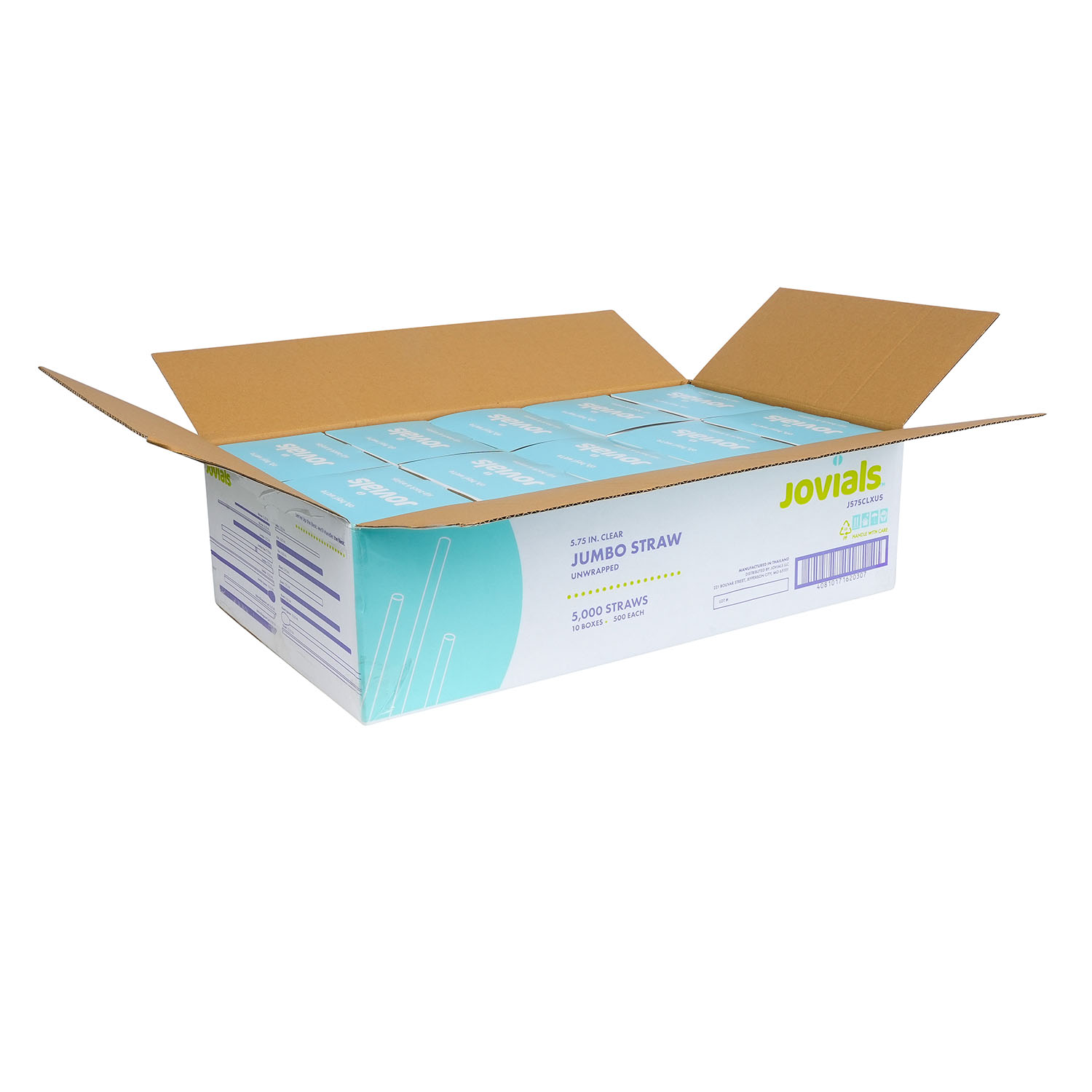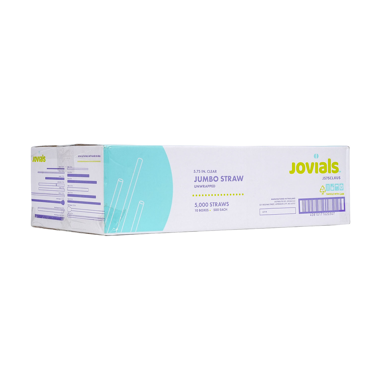 Designed for water, juice, and soda, Jovials Jumbo Clear 5.75" Straws come unwrapped for quick and easy use. Conveniently boxed and ideal for high-traffic food service locations with bulk dispensers.
