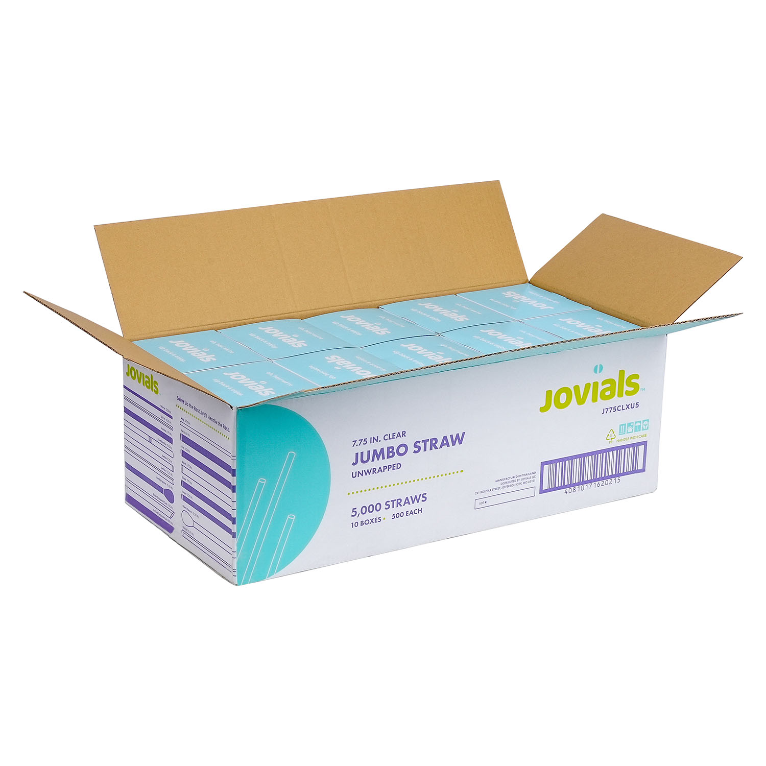 Designed for water, juice, and soda, Jovials Jumbo Black 7.75" Straws come unwrapped for quick and easy use. Conveniently boxed and ideal for high-traffic food service locations with bulk dispensers.
