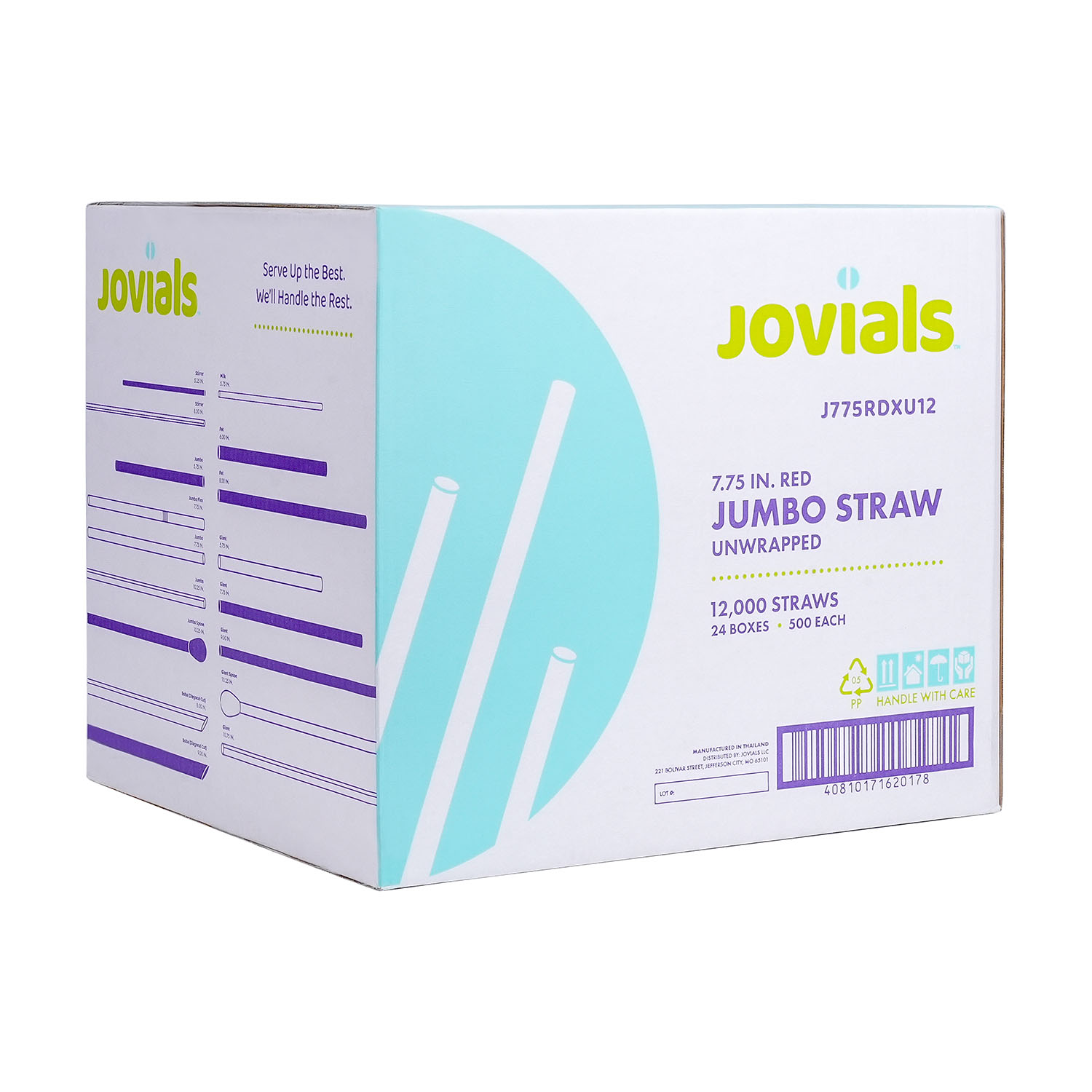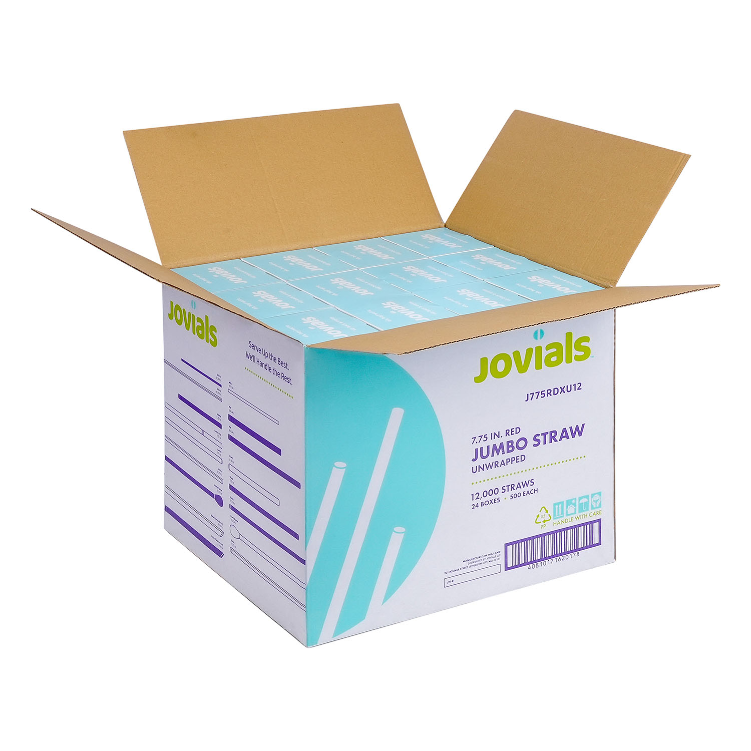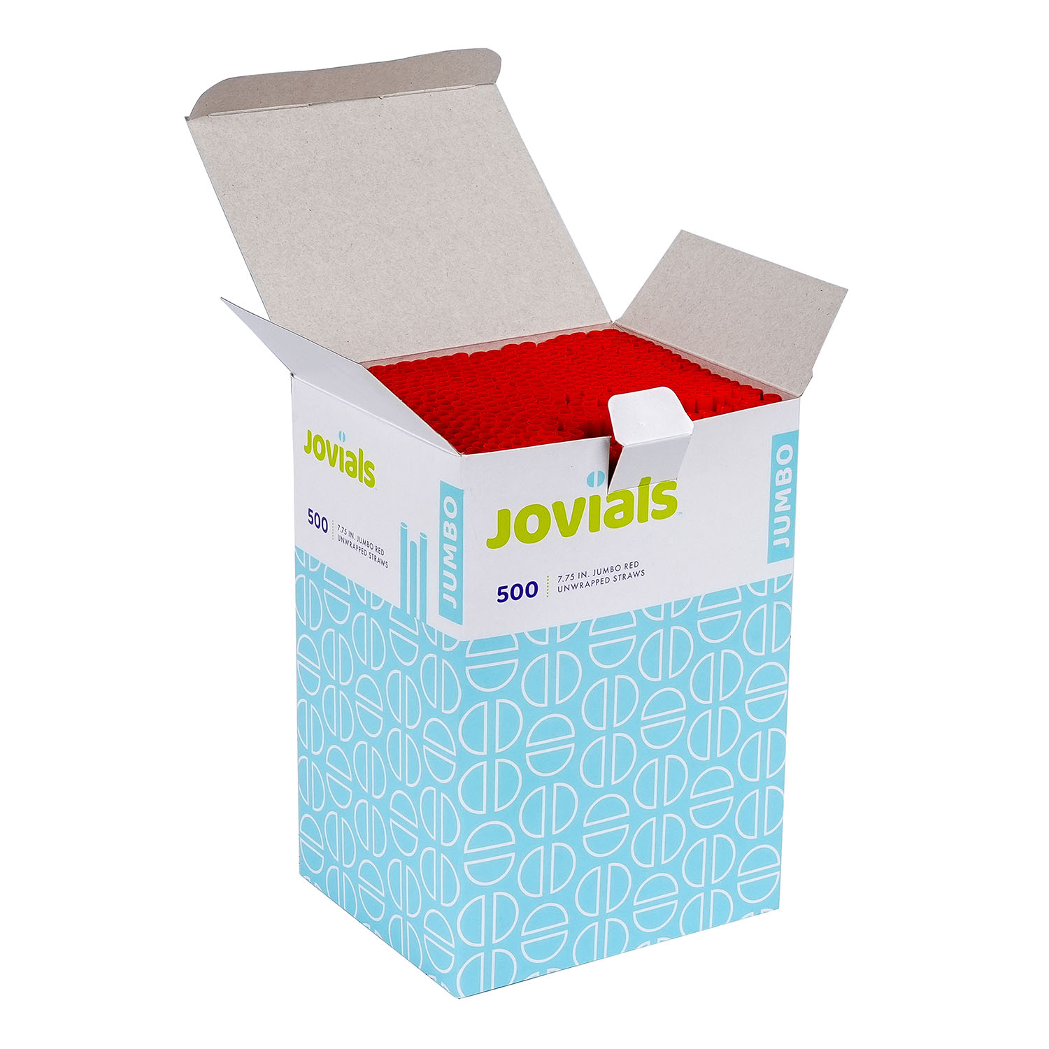 Designed for water, juice, and soda, Jovials Jumbo Red 7.75" Straws come unwrapped for quick and easy use. Conveniently boxed and ideal for high-traffic food service locations with bulk dispensers.