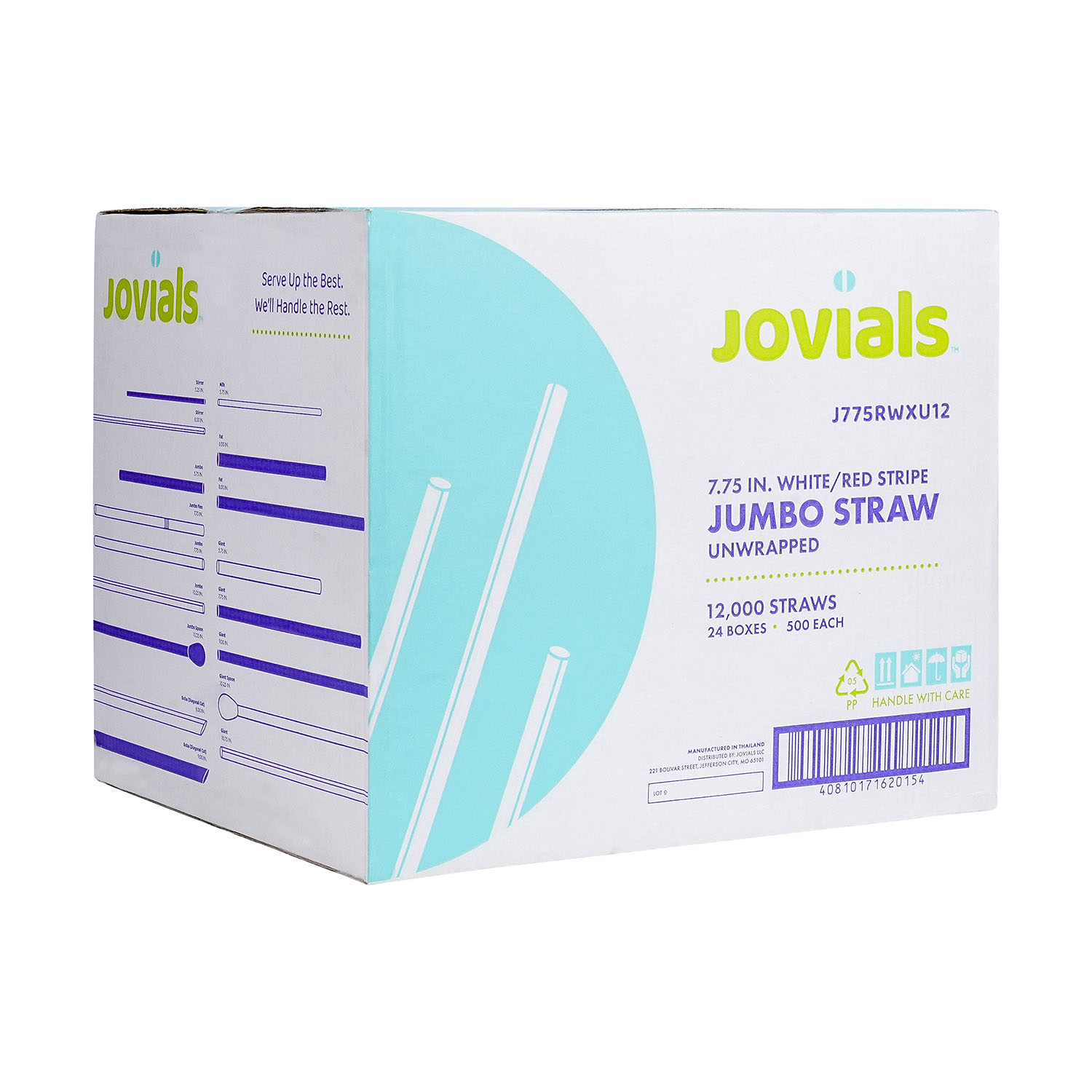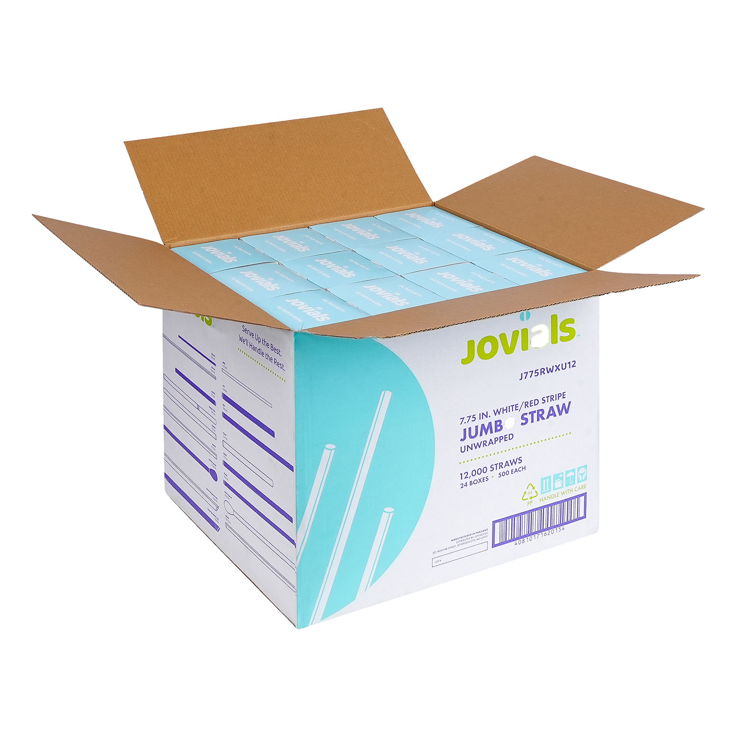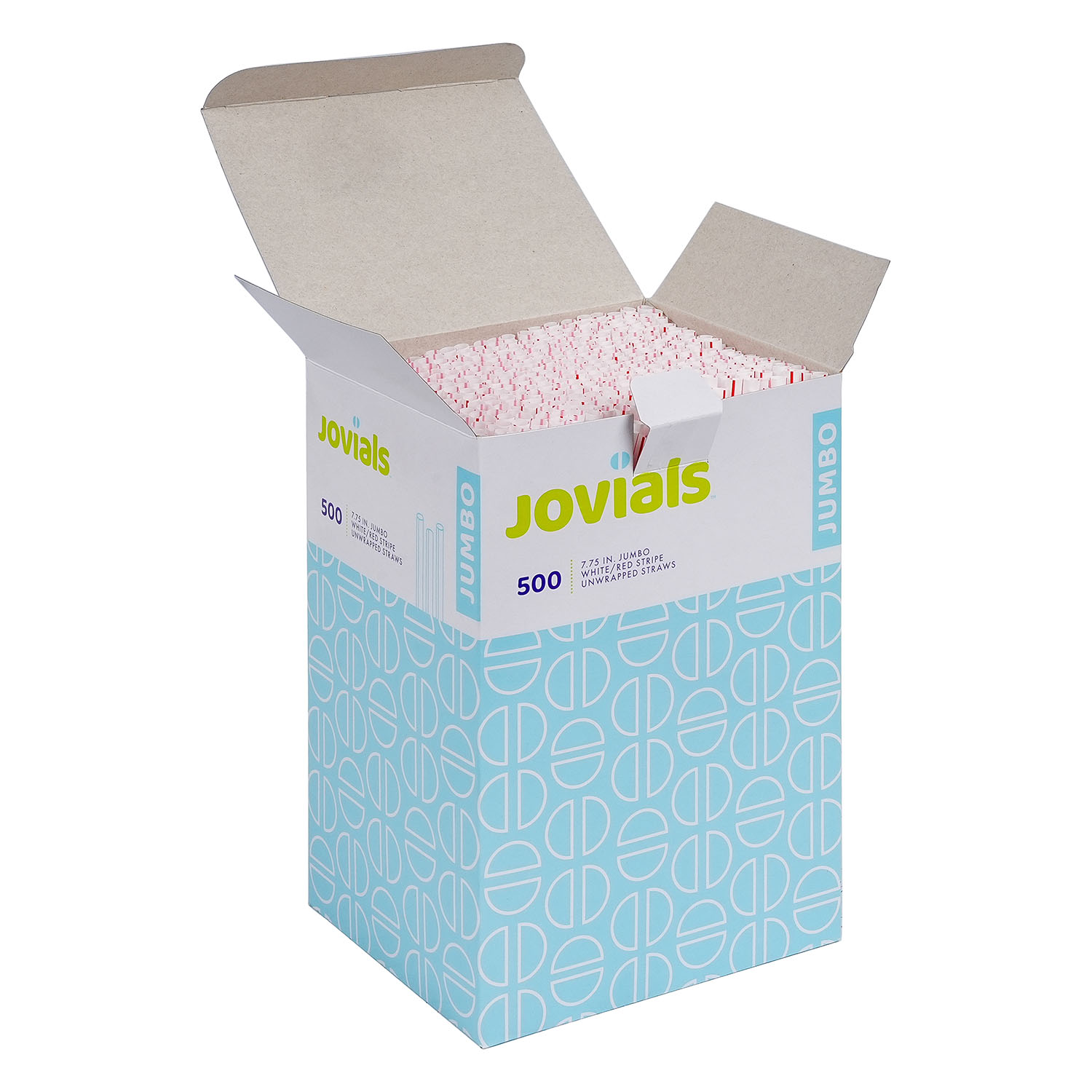 Designed for water, juice, and soda, Jovials Stripe Jumbo Red and White 7.75" Straws come unwrapped for quick and easy use. Conveniently boxed and ideal for high-traffic food service locations with bulk dispensers.