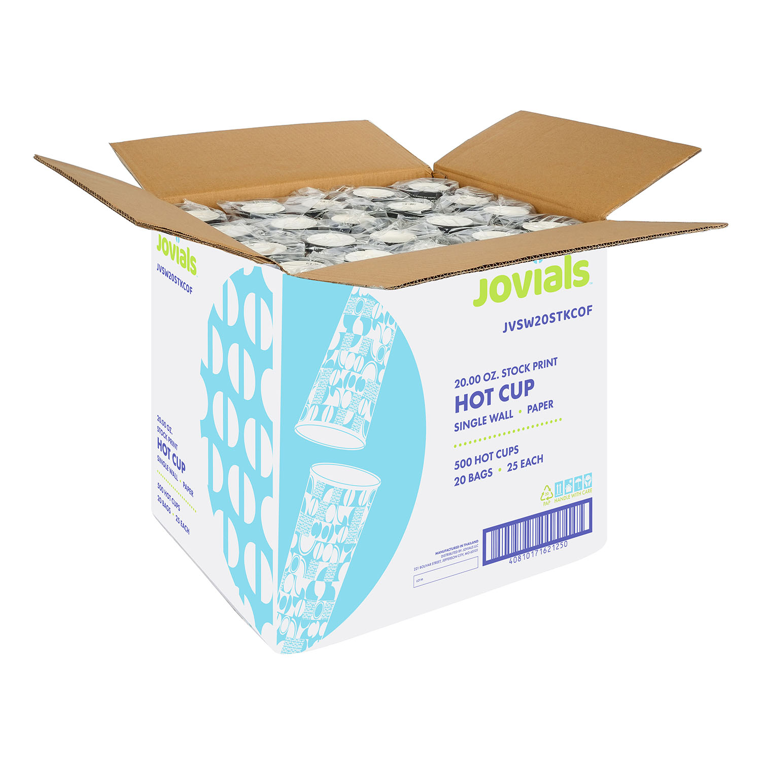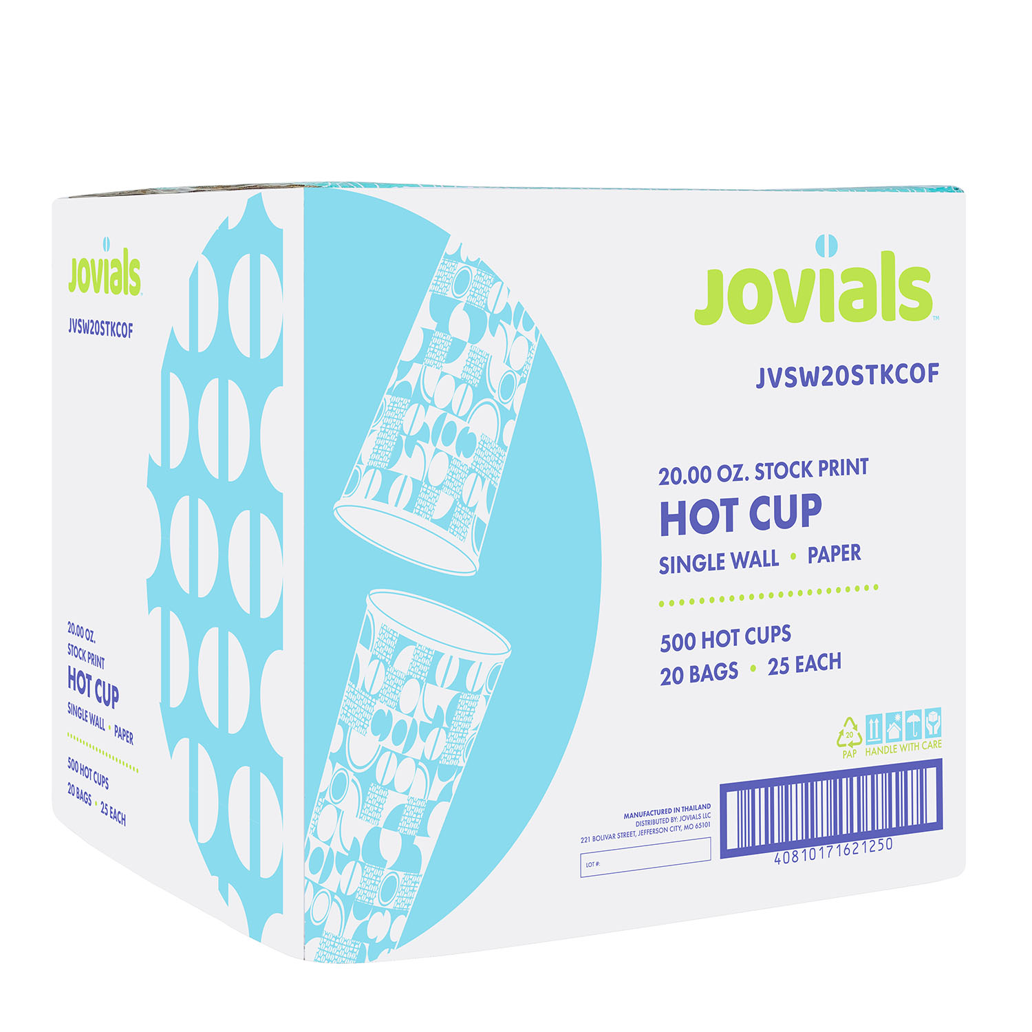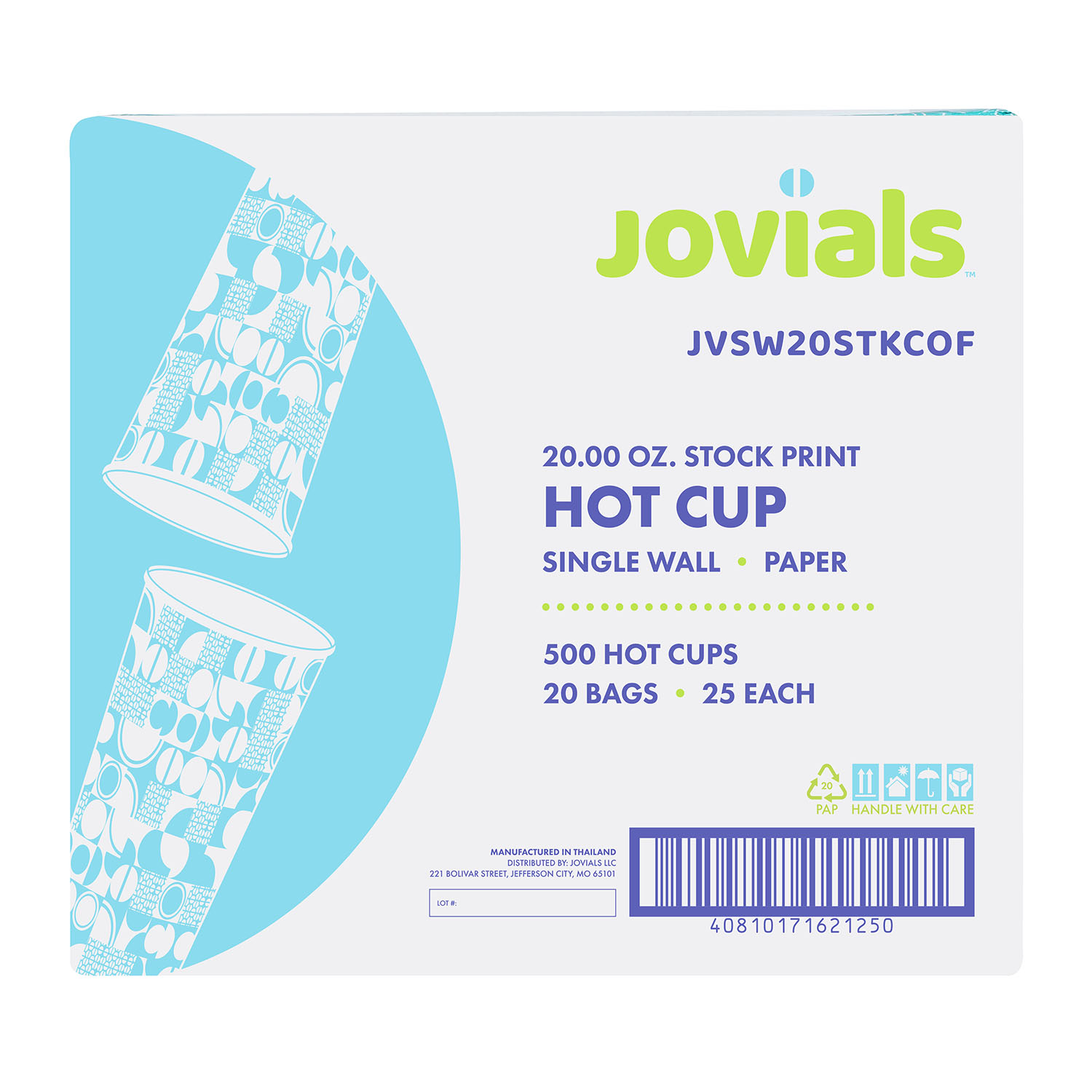 With a stylish coffee print, Jovials 20 oz. Single Wall Paper Hot Cups are perfect for cafes, kiosks, concession stands, and convenience stores. These cups feature tapered sides for a secure grip, a rolled rim for comfortable, leak-free sipping, and a lining to reduce condensation. Stackable for optimal storage space, they are compatible with Jovials coffee sleeves and lids for convenient, on-the-go use.