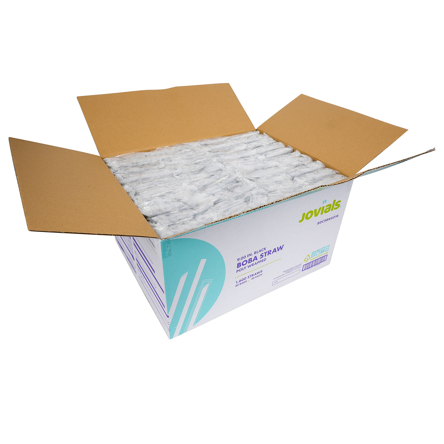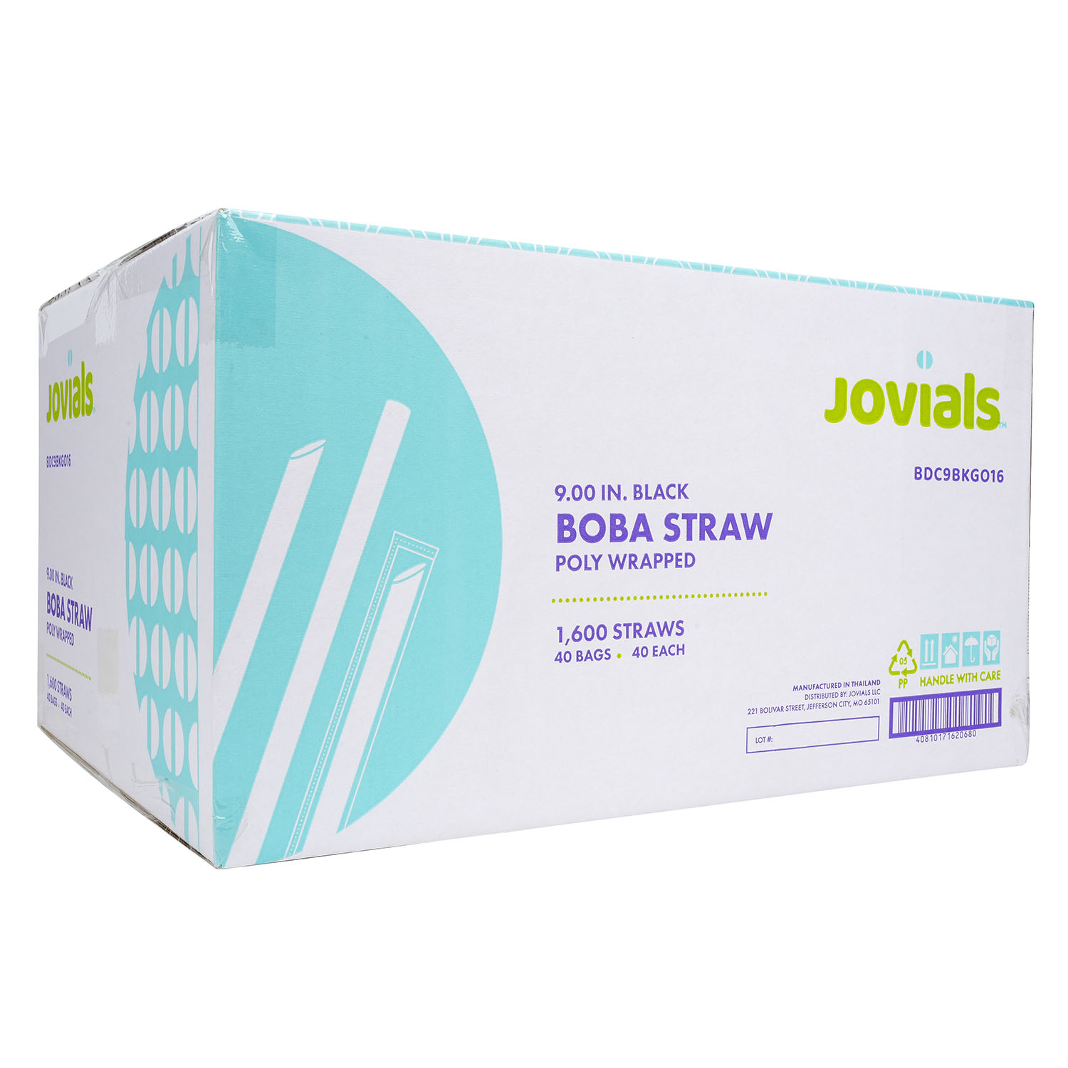 Jovials Boba 9" Black Straws feature a pointed, diagonal cut tip to easily pierce boba tea film. Individually wrapped for sanitation and bagged in bulk for easy storage, these straws are perfect for beverage stands, ice cream shops, and cafés.