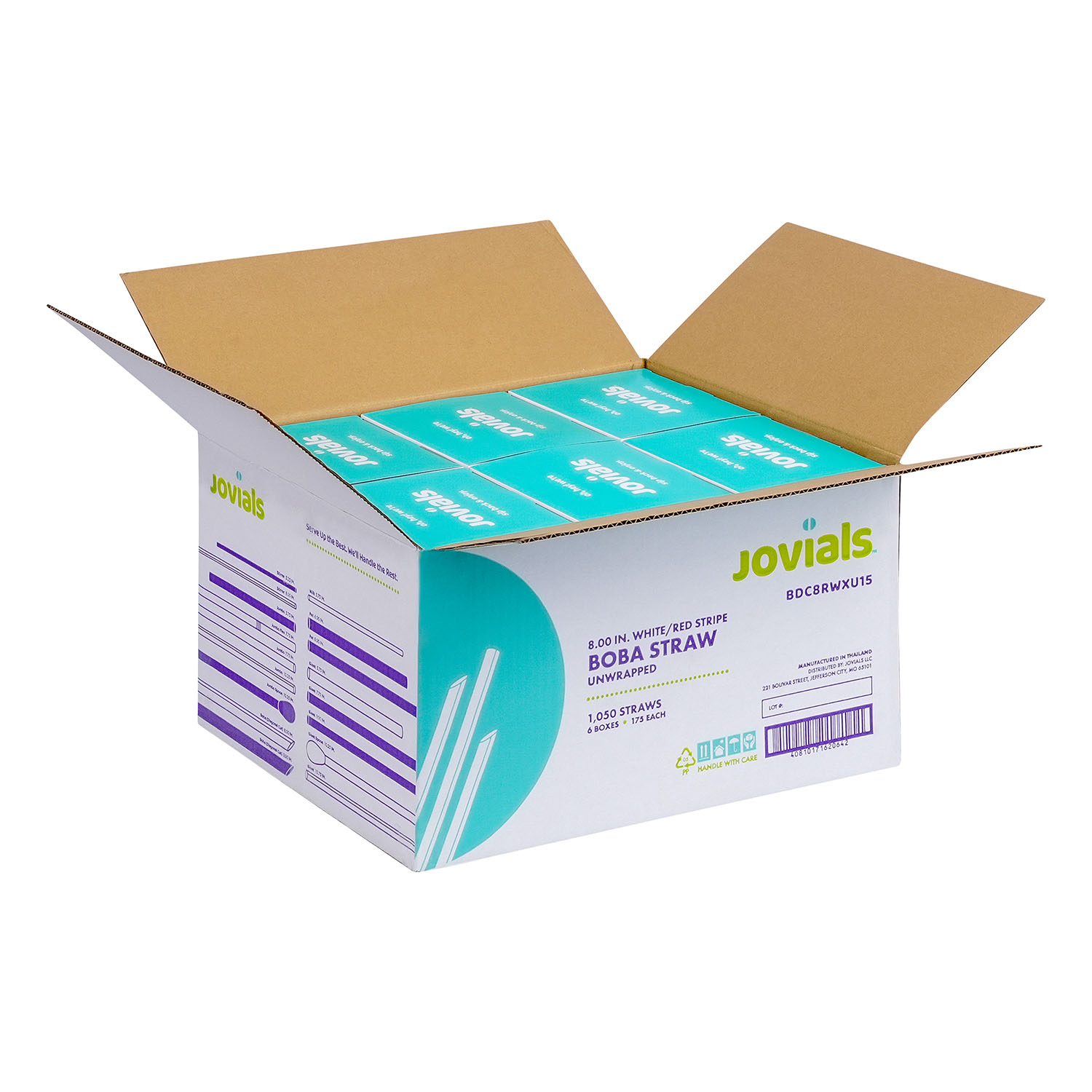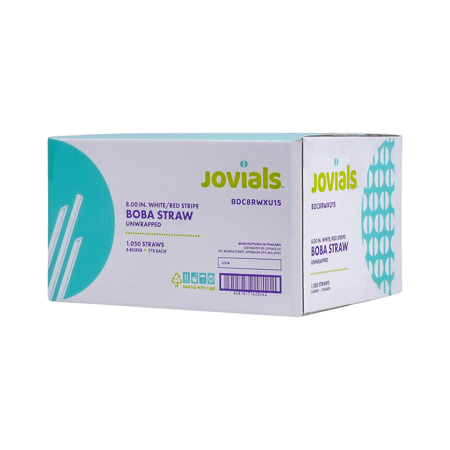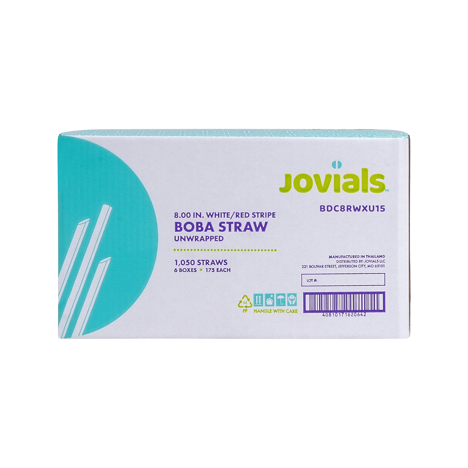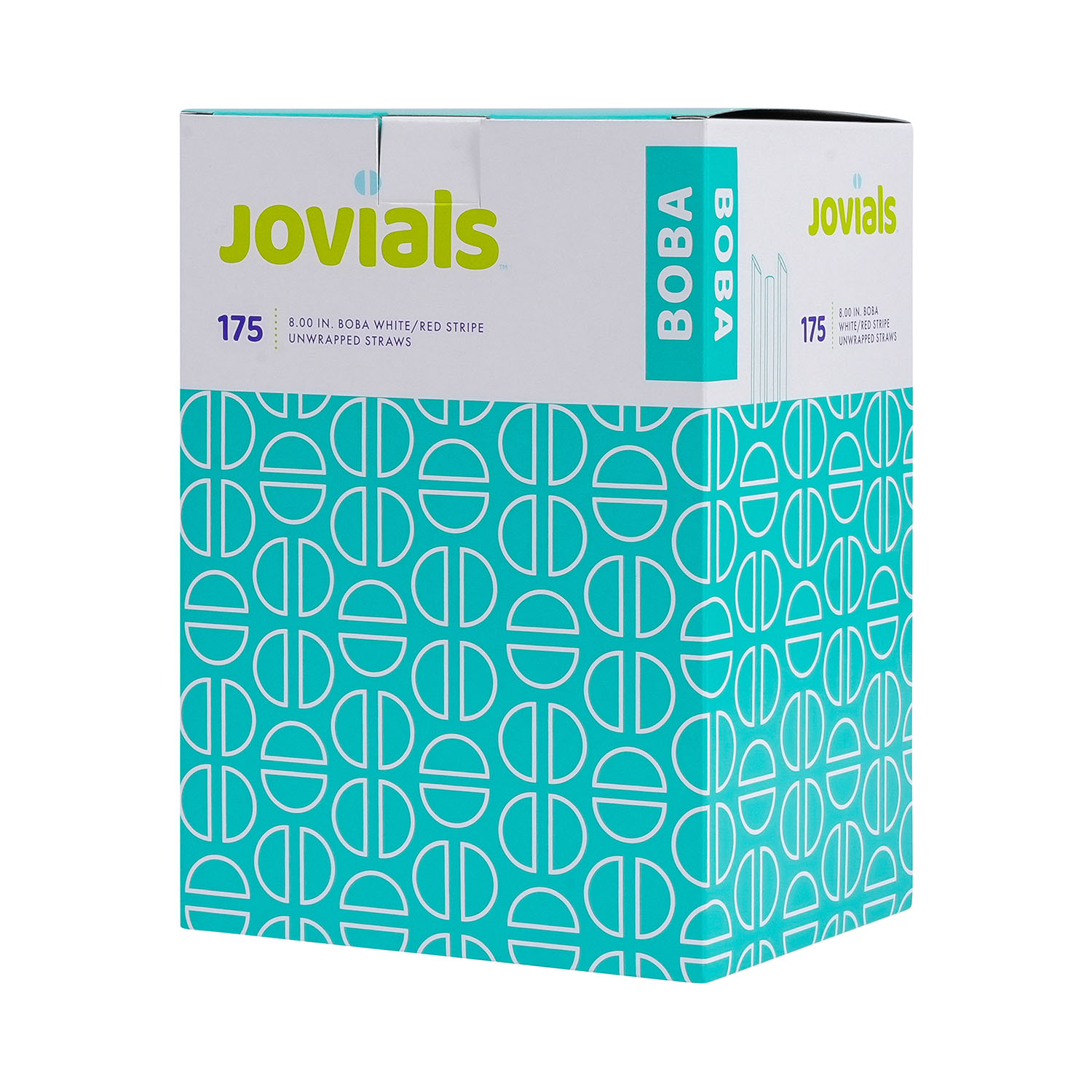 Jovials Boba 8" Red and White Straws feature a pointed, diagonal cut tip to easily pierce boba tea film. Boxed in bulk for convenience, these straws are perfect for beverage stands, ice cream parlors, and cafés that need quick and easy access for fast service.